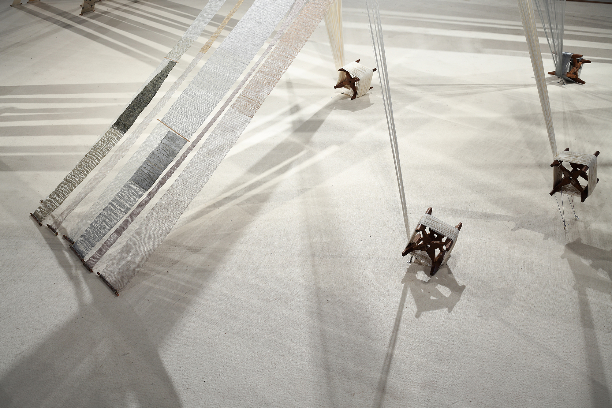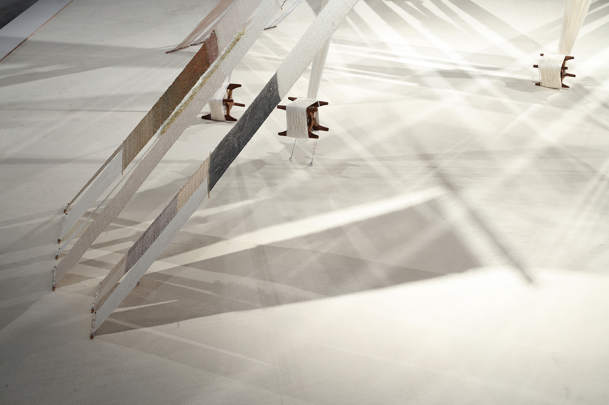 將織布機穿線的綜片作為作品的數個山頭提領,拉出整件作品的結構。讓纖維從筬的縫隙中互相牽引、放射或拉鋸,形成山勢與路徑。