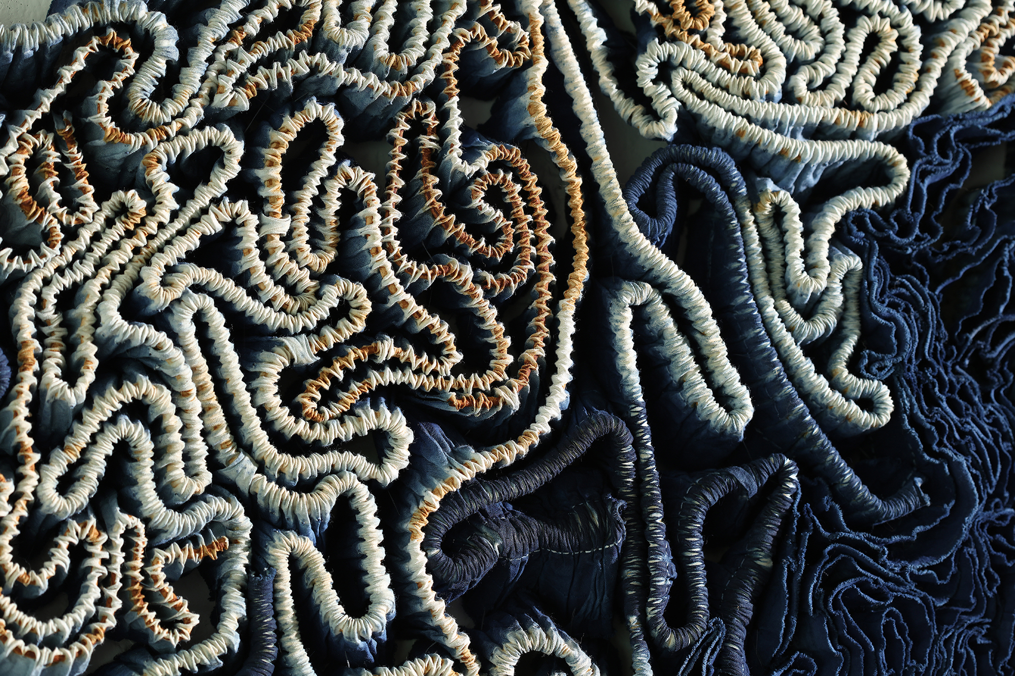 With indigo dye and rustic dye, this work shows two sides at once. Indigo dyeing is alkaline, reductive, viable and overlapping. Rustic dyeing is acidic, oxidative, decaying and scaly.