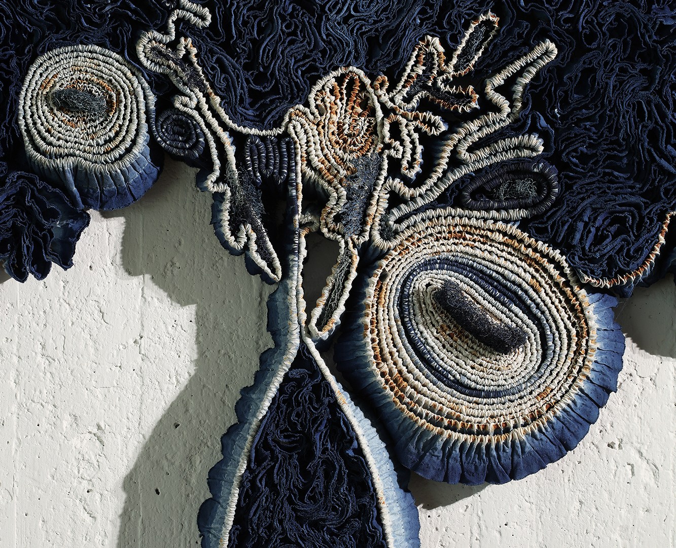 With indigo dye and rustic dye, this work shows two sides at once. Indigo dyeing is alkaline, reductive, viable and overlapping. Rustic dyeing is acidic, oxidative, decaying and scaly.