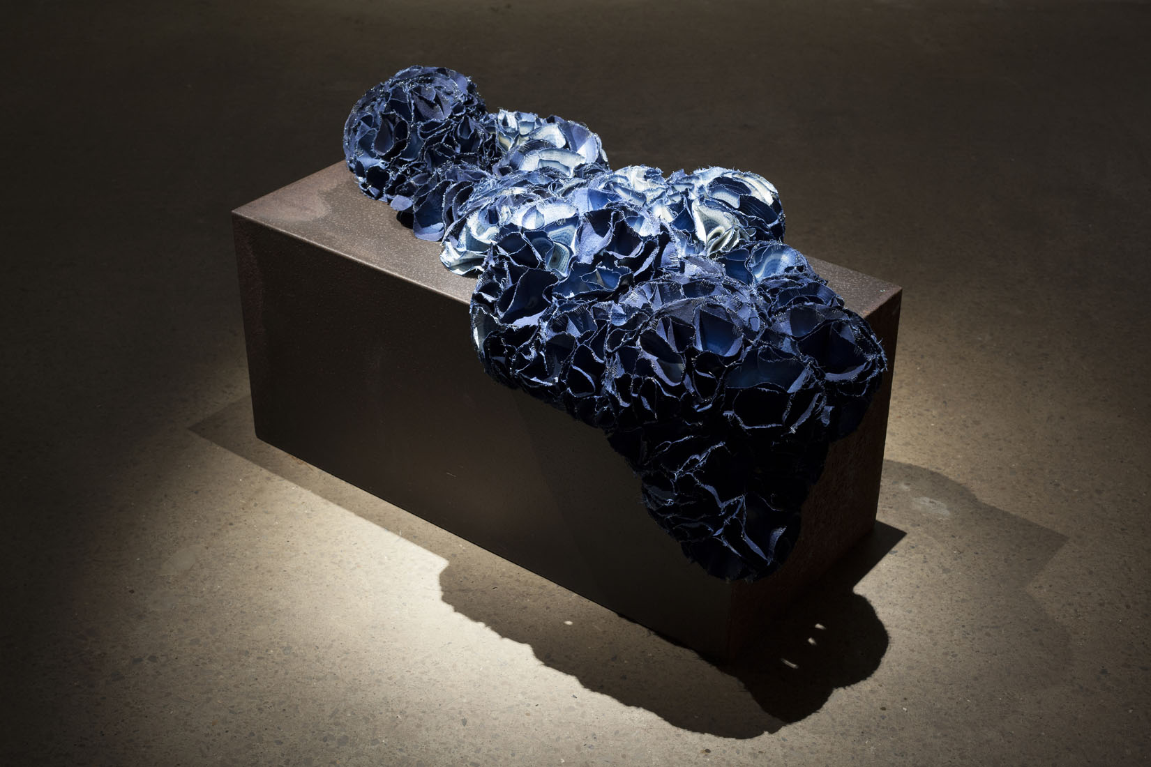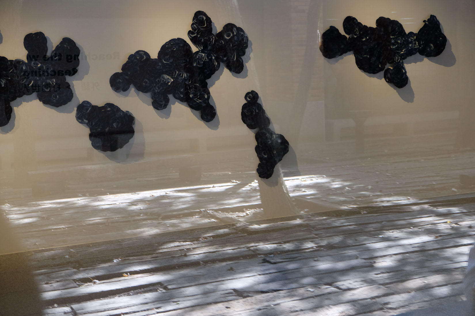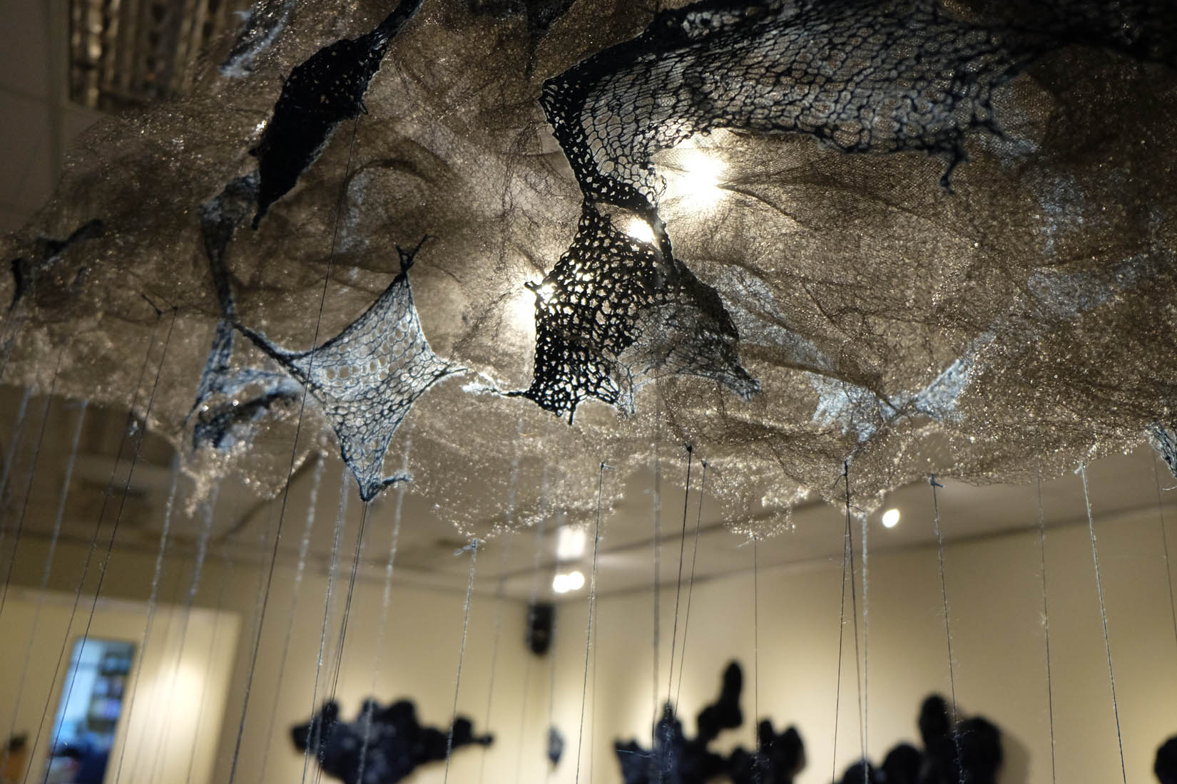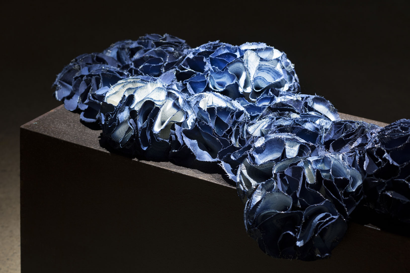 Cloth wheels are assembled to make drifting islands. In different shades and depths, different relational spaces, they seem to turn around from the ocean and gaze at the land.