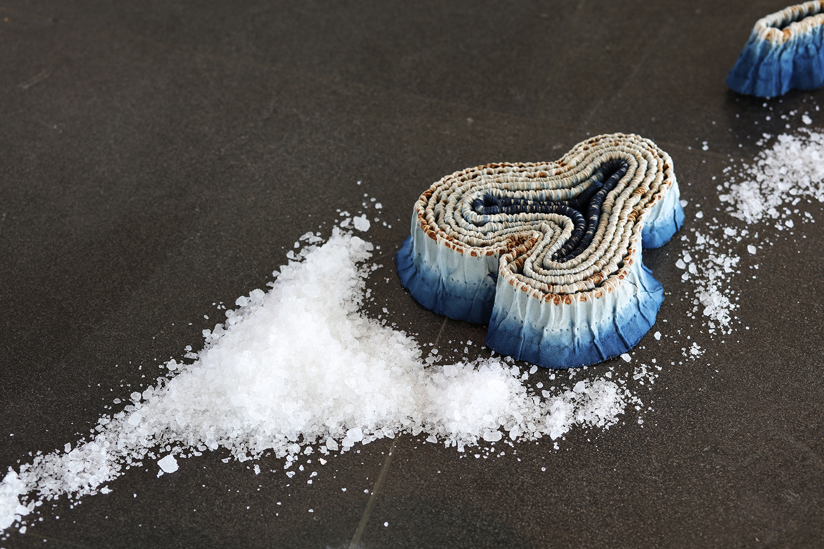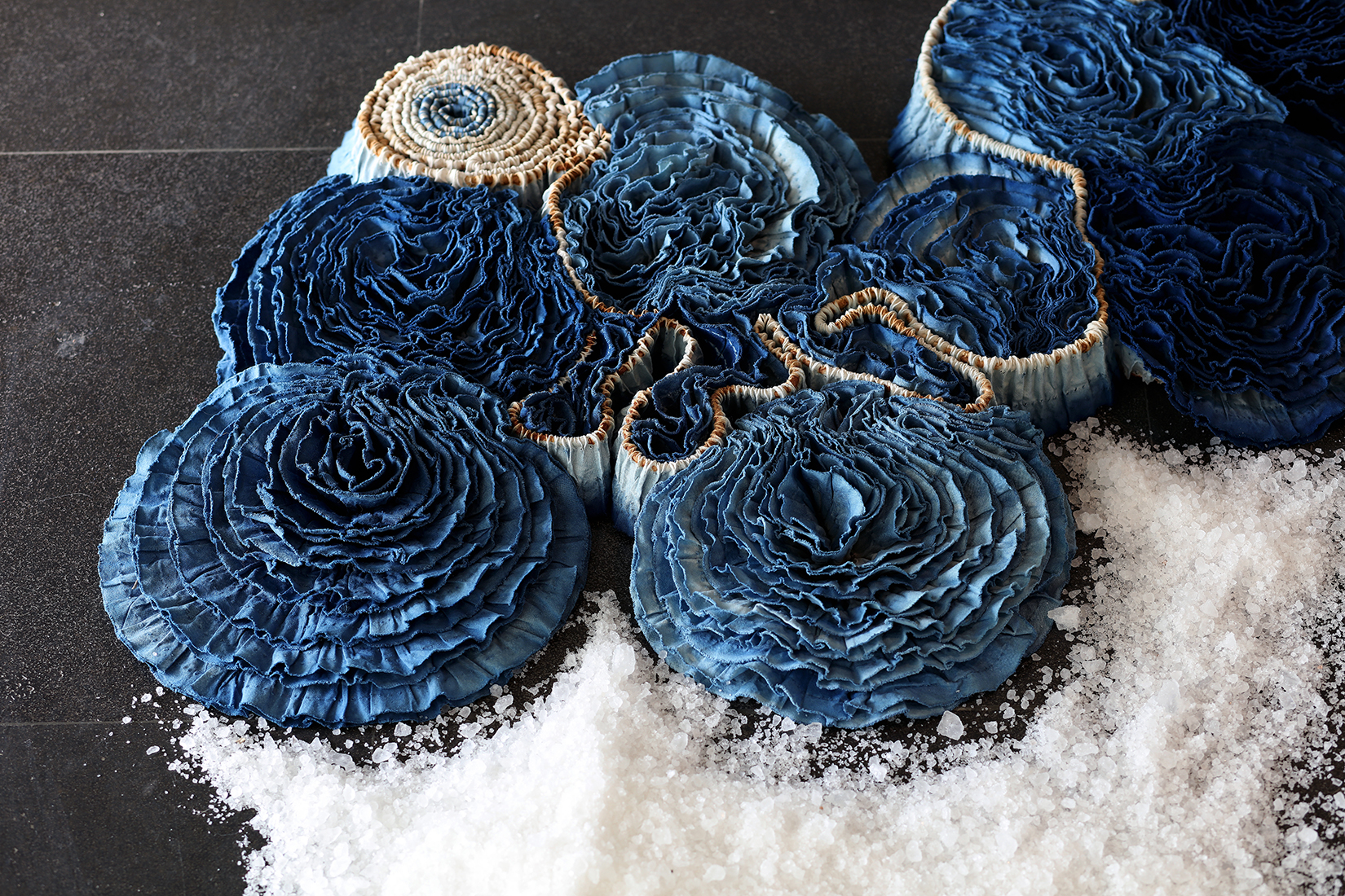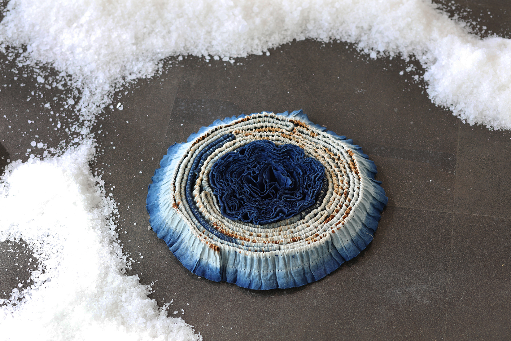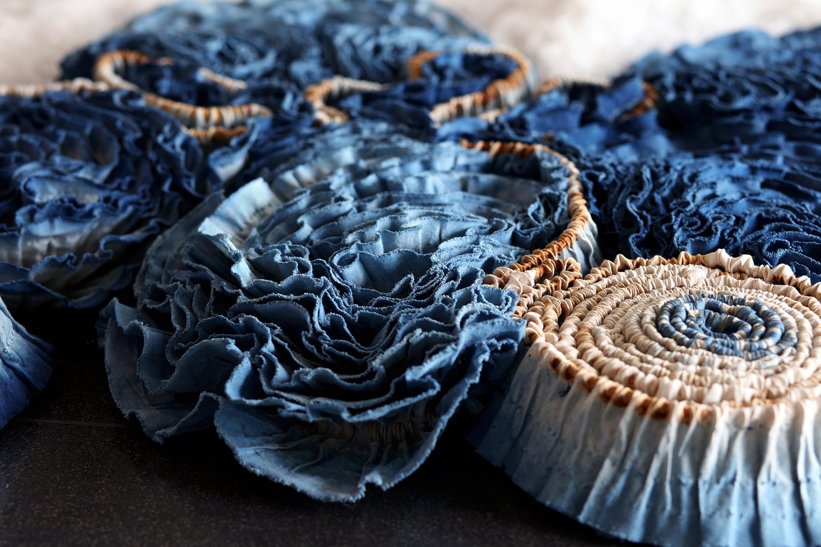 2013年之後,我嘗試使用布輪這個工業生產的消耗性材料結合天然藍染創作; 利用拆除布輪原本縫線的不同方式,重複染色以呈現色彩的層次變化。藉由工業的消耗性材料與歷經興衰再復原的傳統天然材質互相對話,訴說台灣這個島嶼在當下環境的雙面性格。