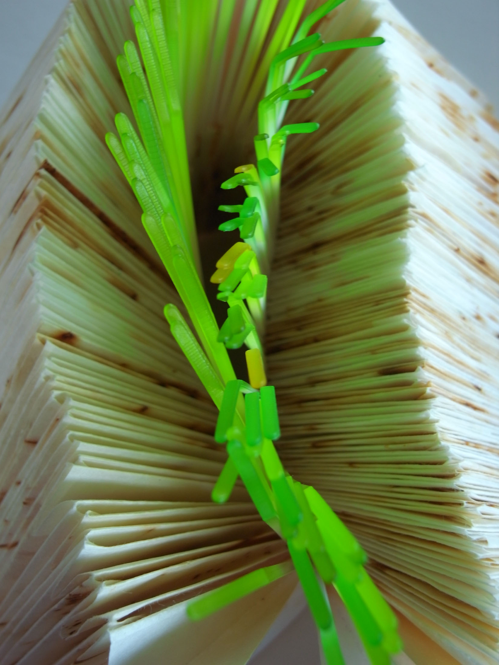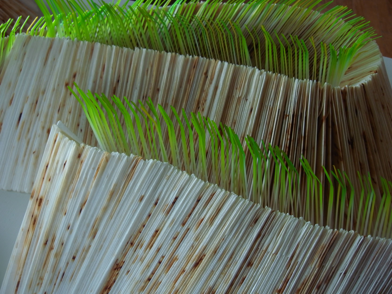 這個夏末,在藏山望海的台北藝術大學,圖書館閱覽室的大片玻璃窗外是關渡平原綠油油的稻色。花了一個禮拜時間用鐵鏽染出來的八百多張濾紙,再經過漂洗、整燙、摺疊、切割,用染過深淺綠色的束帶一路串起,綿延出層層疊疊的山谷書頁。鏽痕經過折疊隱藏在山凹折頁深處,不翻動書頁是無法閱讀到的,大部分的秘語與傷痕就此失落在土堆裡,只有鮮綠迎風招搖。