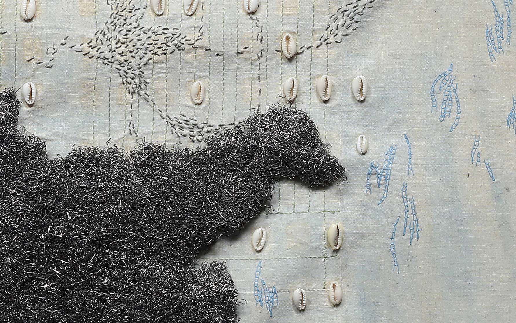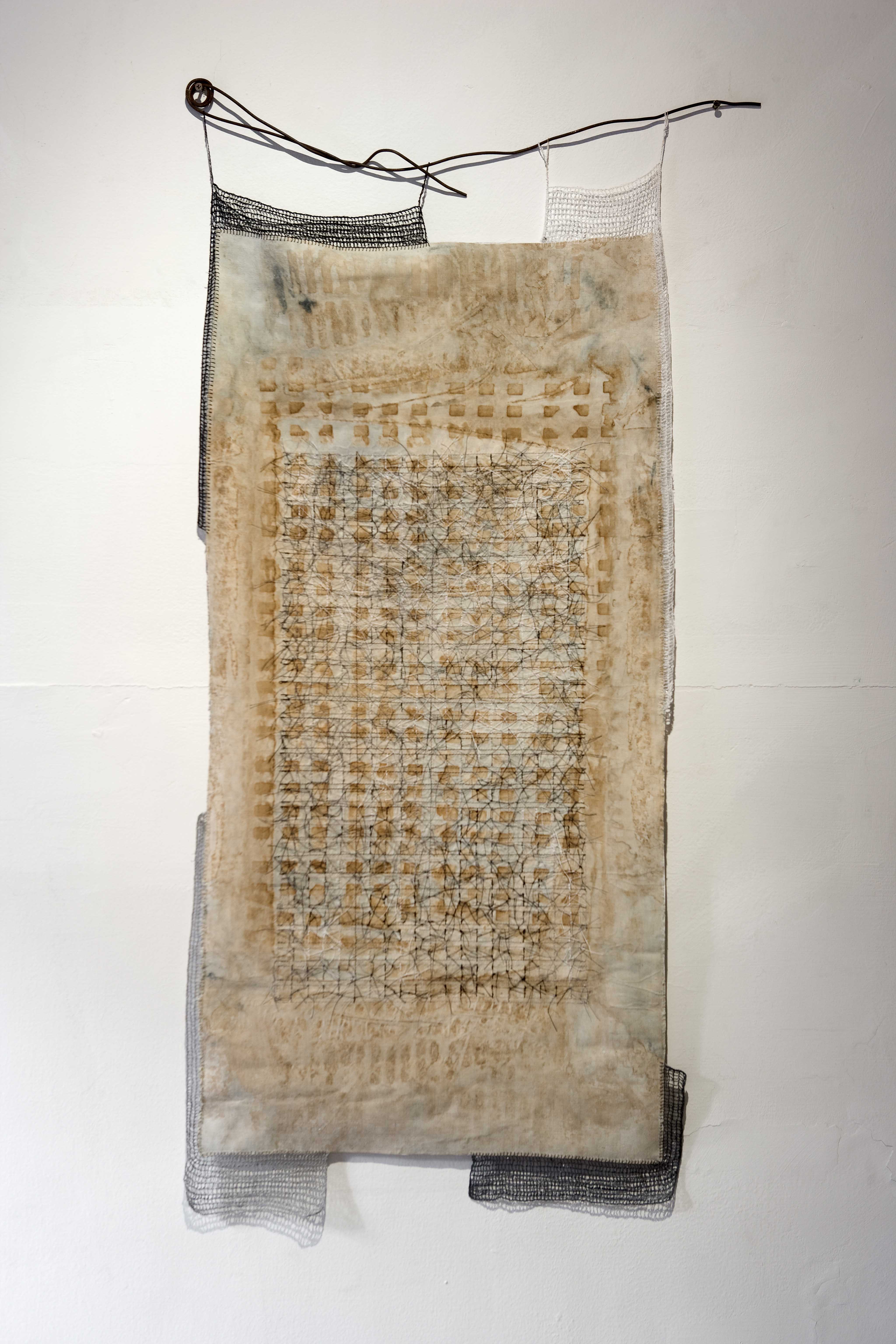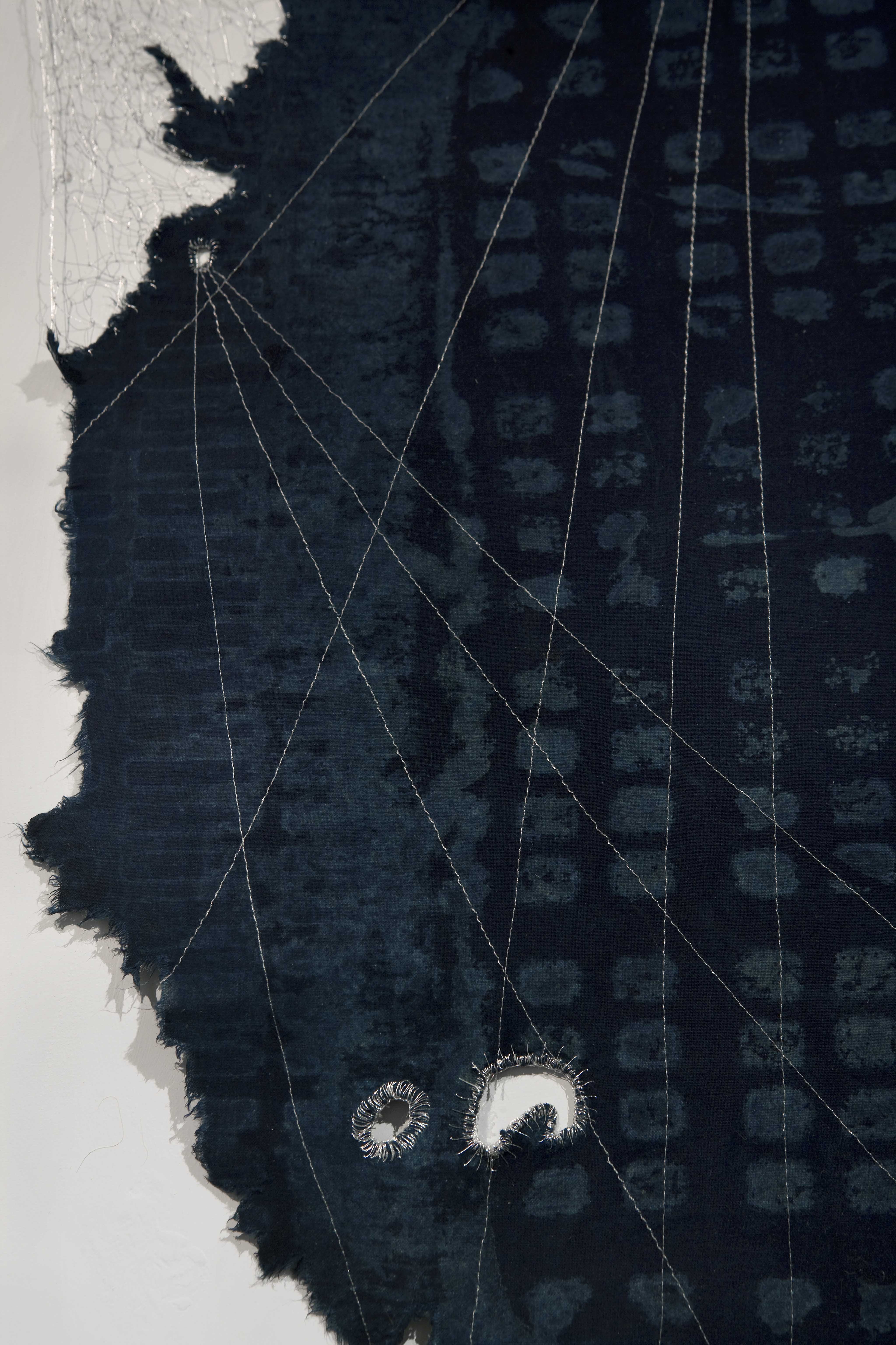製作藍靛過程中過濾石灰水所用的濾布留下了工作的痕跡,綿延交錯曲折纏繞的縫繡線走過另一層書寫的意圖或非意圖。
