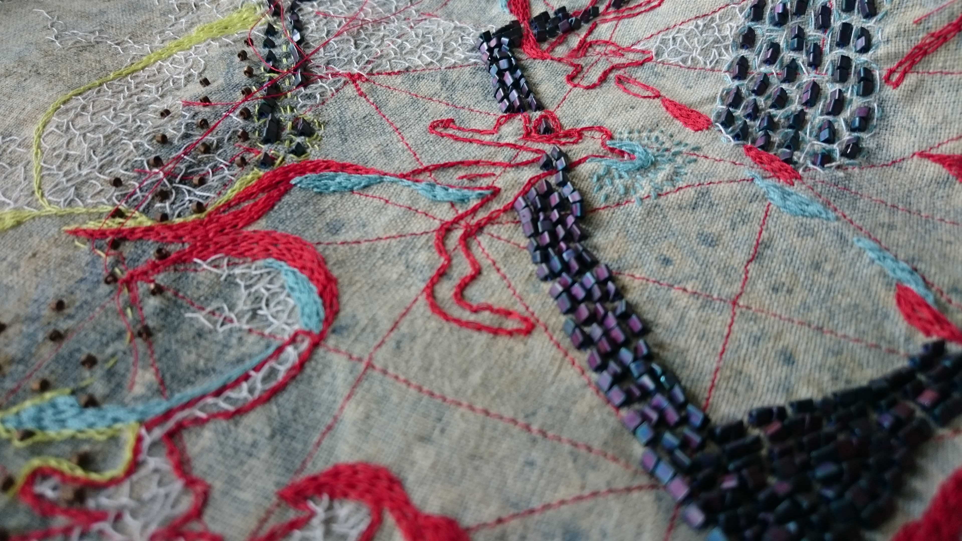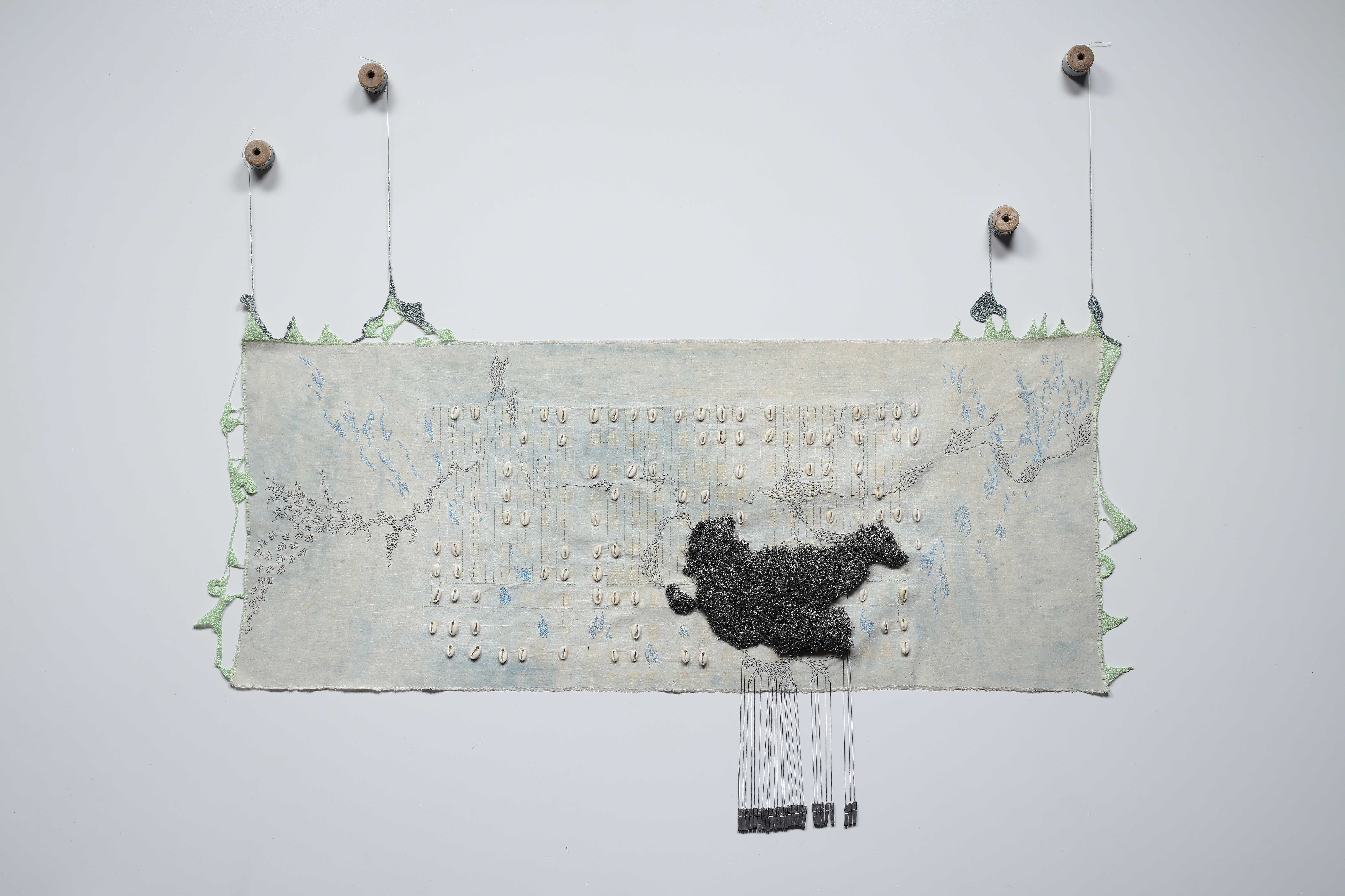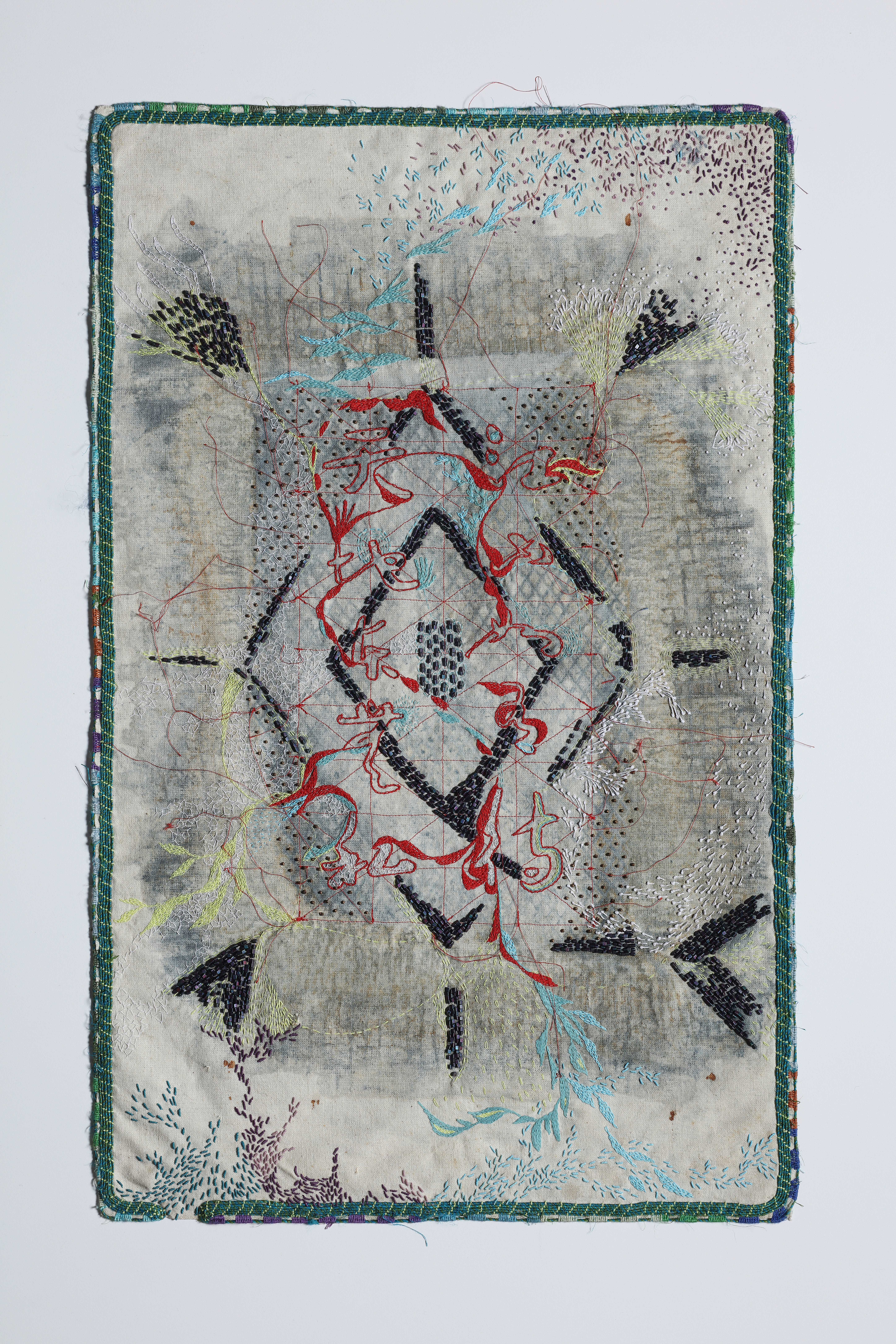 Arrangements are made in the forms of writing and recording, using manuscript paper, maps, calligraphy, data cards and braille. From text to texture/textile, pen replaced with needle, a journey of writing begins on the indigotic fabric. Knots with bullion stitches and crochets, editing plus accenting; an alternative text achieved through the writing of femininity and labour. Modifiers as such continuously proliferate, hidden in the tortuous windings of the maze of script. They may have remarked or misinterpreted memories of previous lives; perhaps all is in vain.