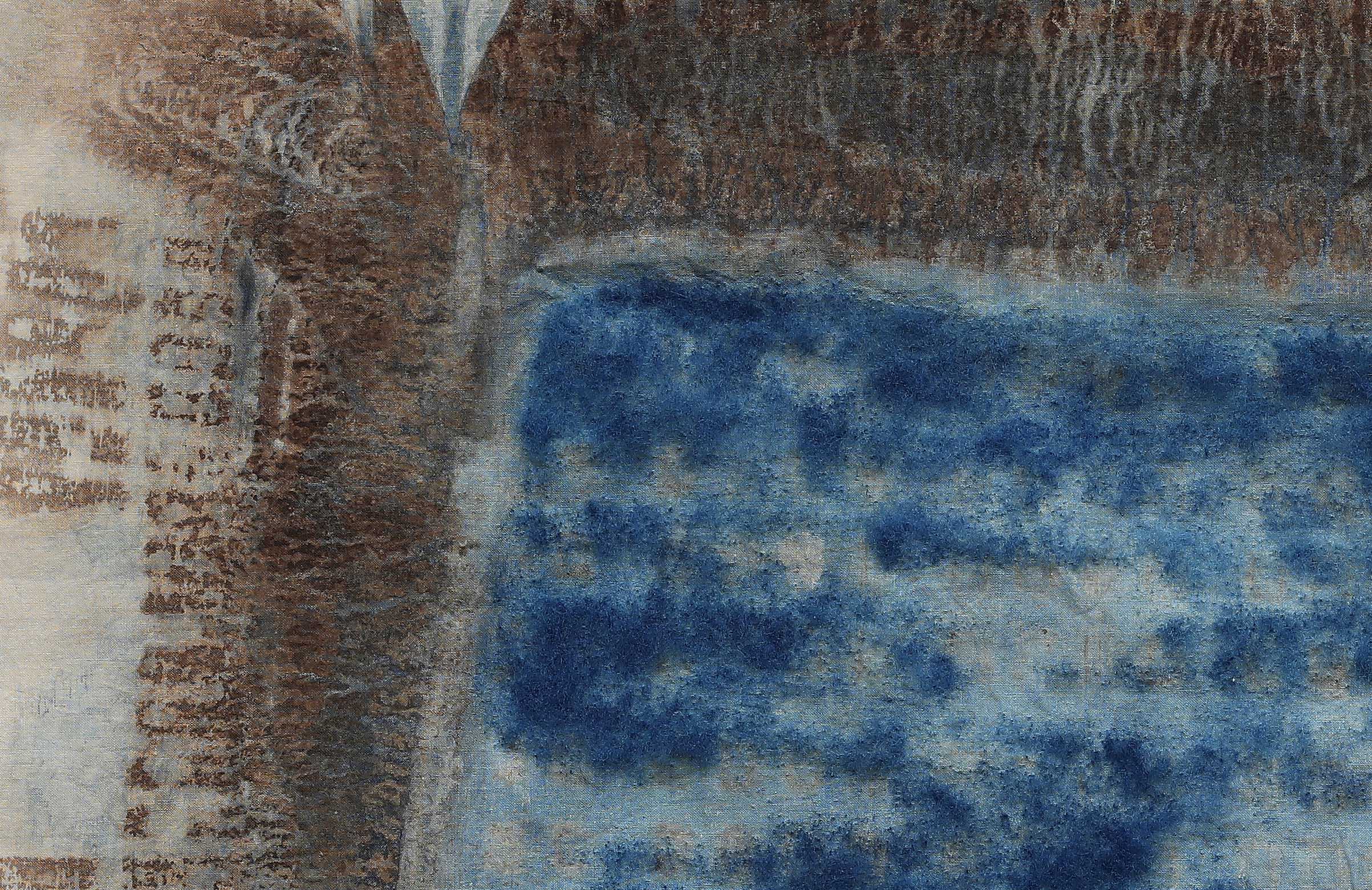 These filter cloths that make up the artwork were used in the process of indigo dye production, during which the settling calcium carbonate in the indigo mix bit into the fabric and left on them traces of time, while friction and weight affected the edges and gave birth to the slits.