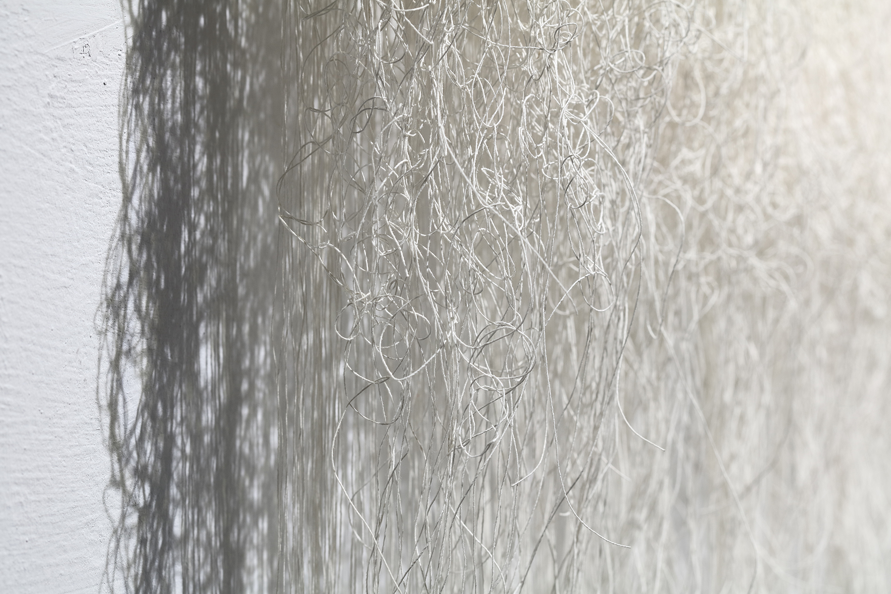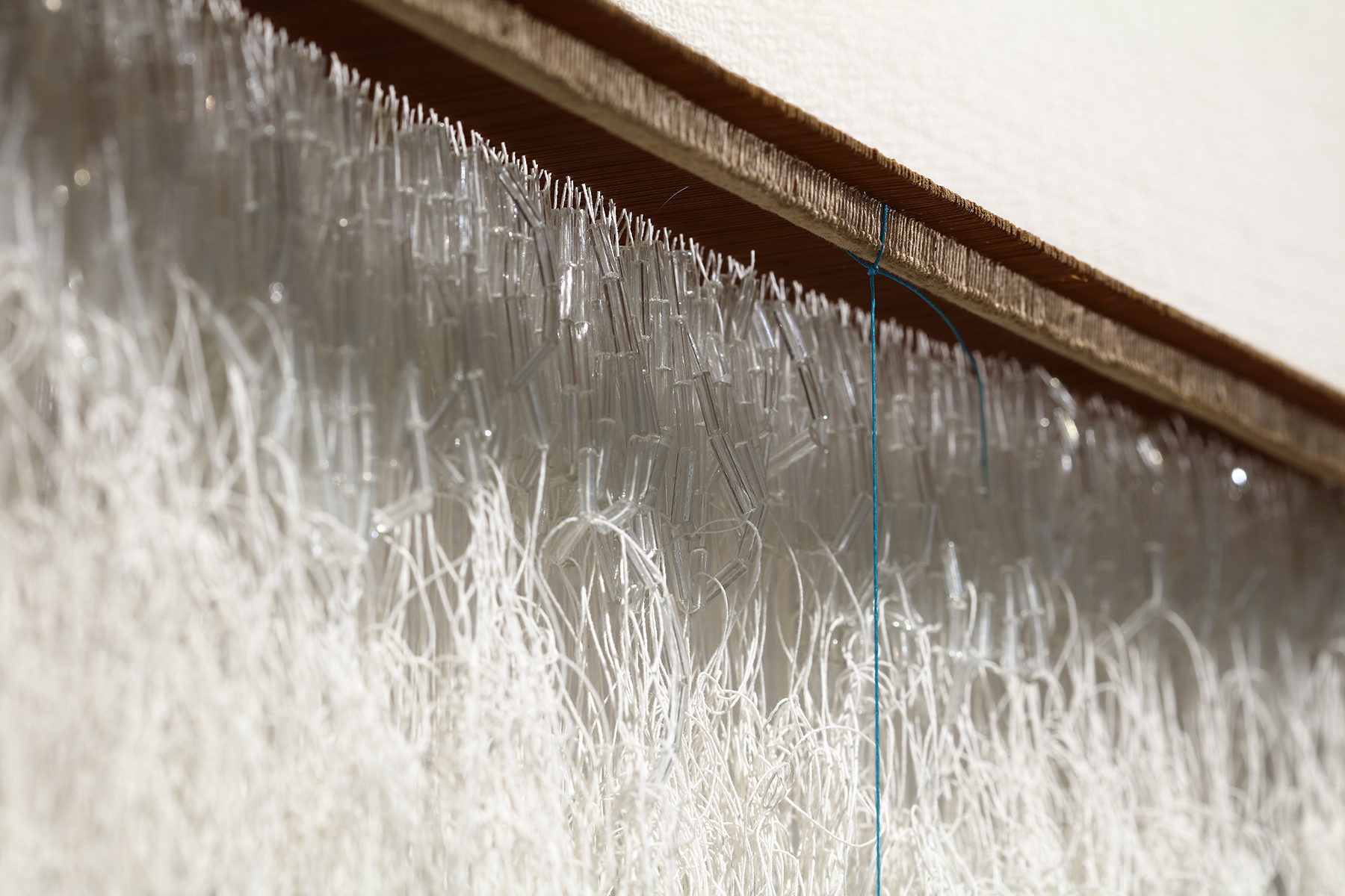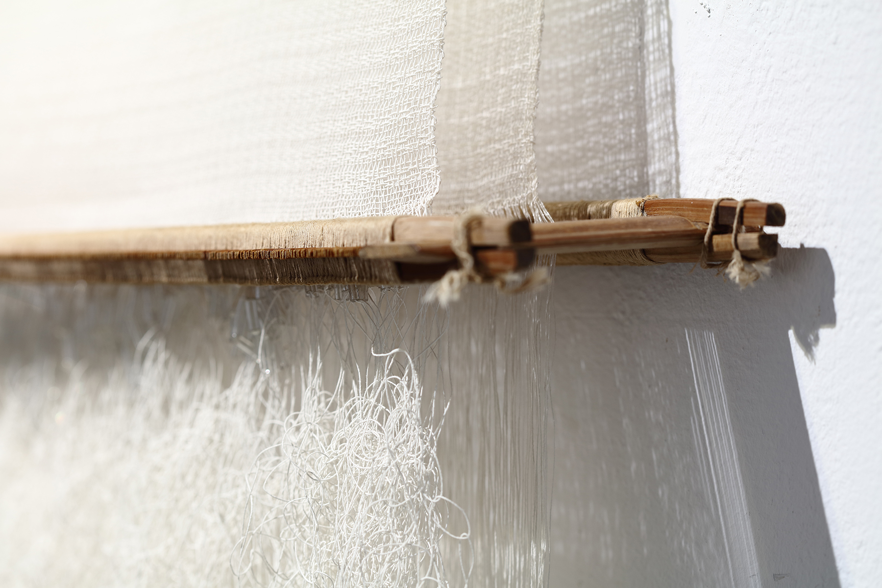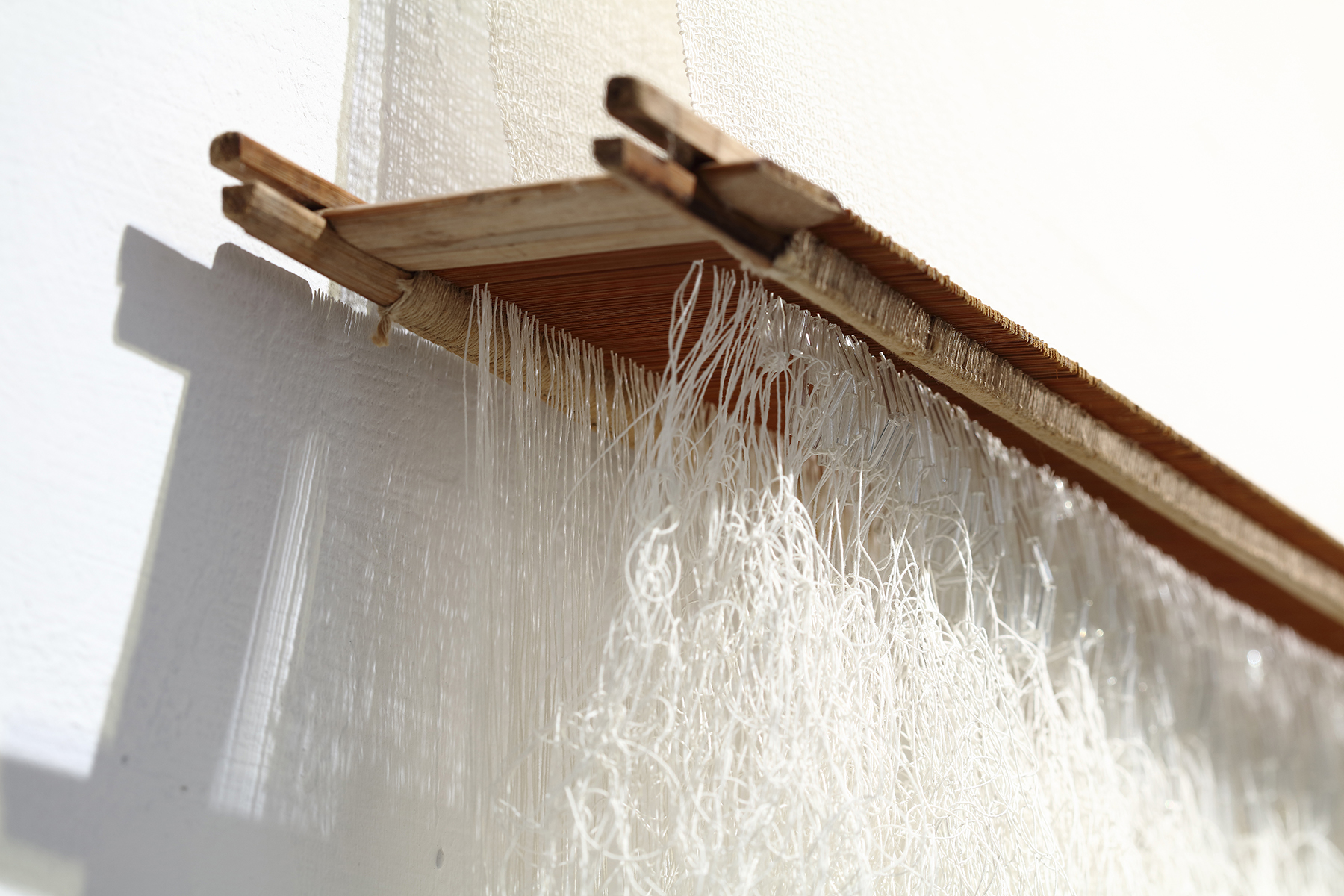 然而,這三組件的作品實則是透過嚴謹的織作理路書寫人在路途中的風景與張望。傳統地織中控制織紋結構的提竿,在此變成竹箭,指涉著行徑的方向;釣魚的浮標與鉛錘,暗示了浮沈牽引的力量;流瀉於織布機經緯邊界外的線,流蘇與織布的相應、相映,淡寫人與自然風景之間的進退和張力。風景是多重的,變幻更甚動靜、遠近或明暗,人若身在其中則不見全景,但體驗自然、五感飛揚,不免受泛靈世界的觸動,偶爾想像無限擴張,或者也有靜心入定的時候。