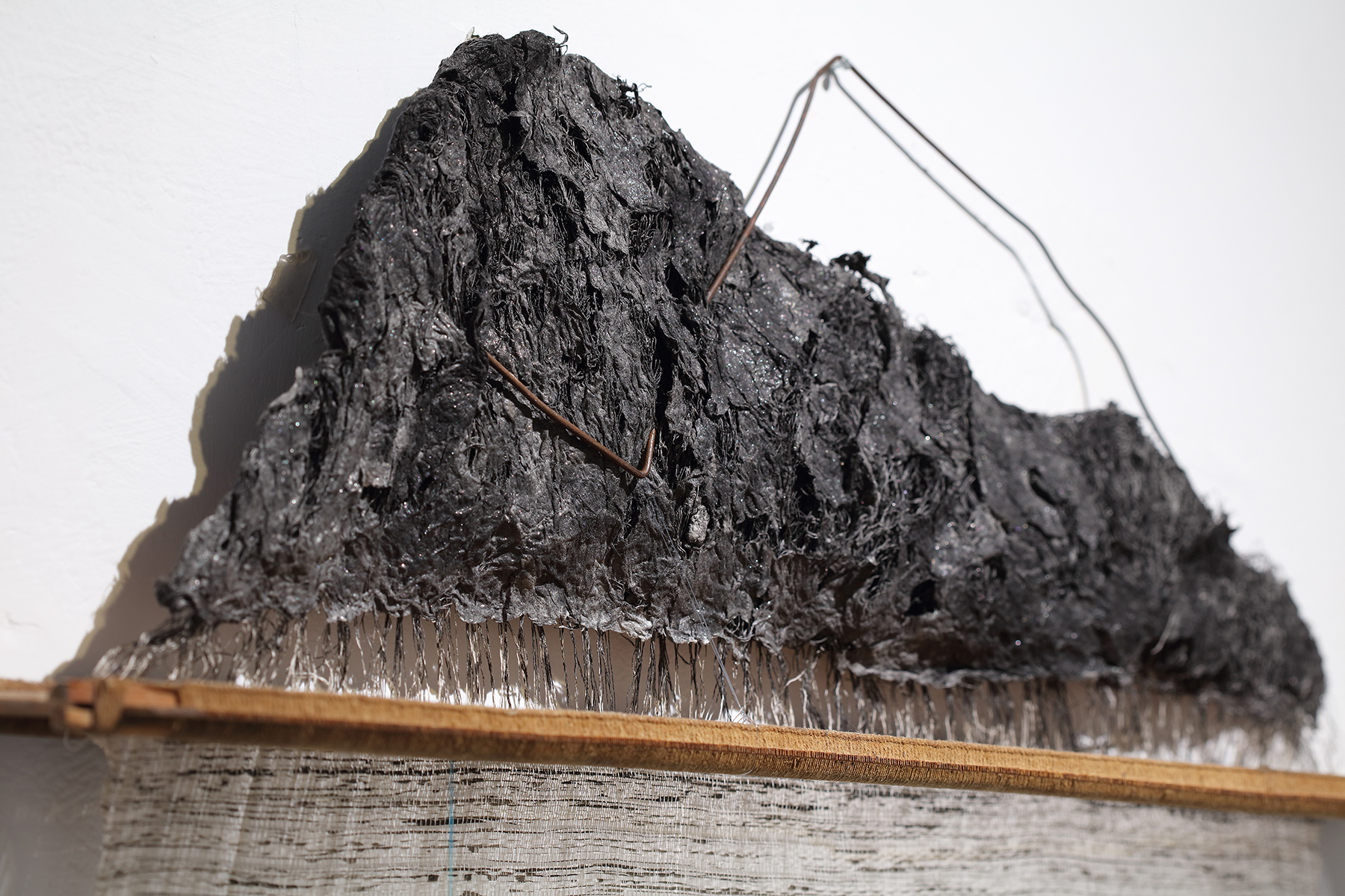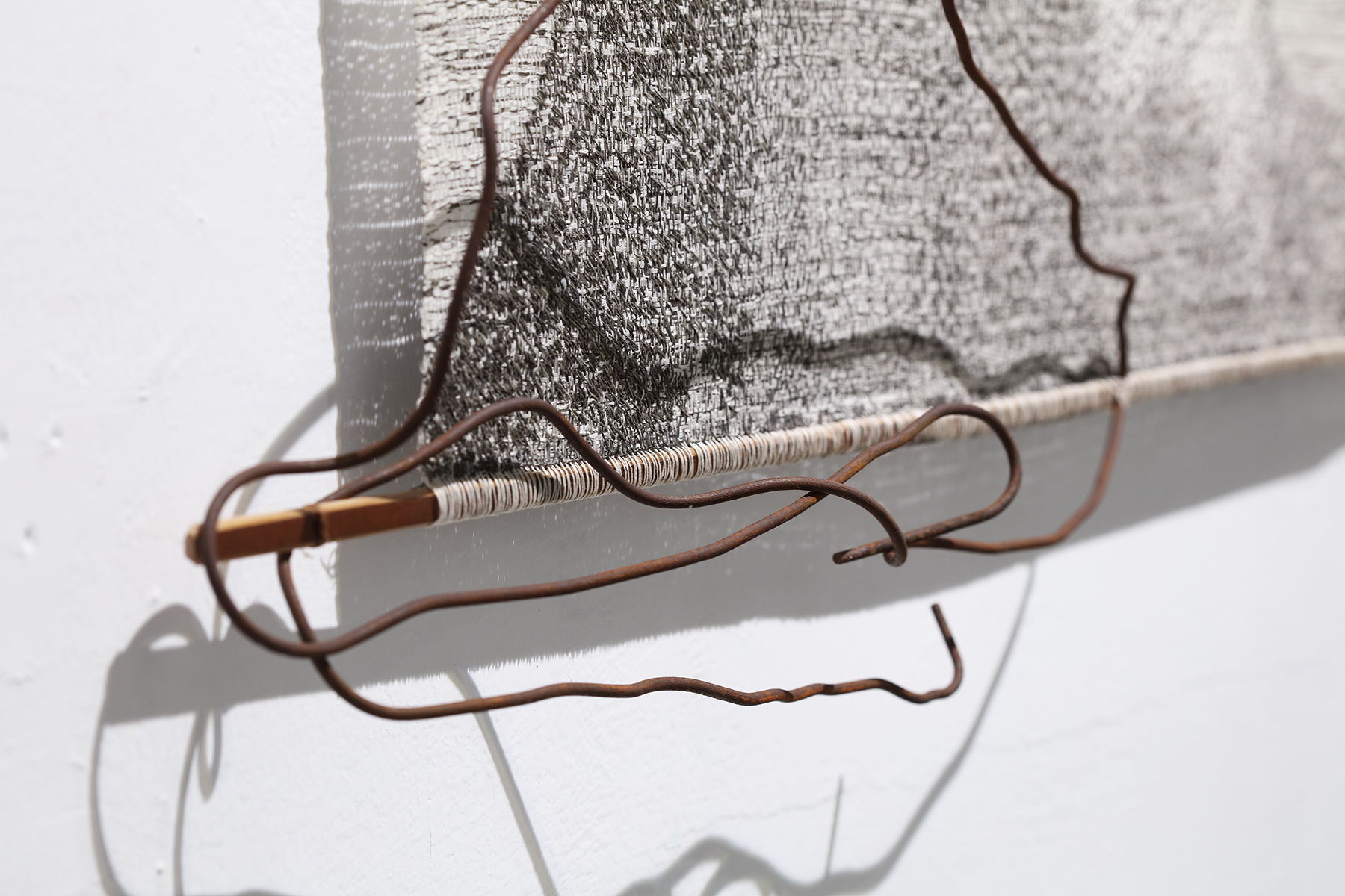 然而,這三組件的作品實則是透過嚴謹的織作理路書寫人在路途中的風景與張望。傳統地織中控制織紋結構的提竿,在此變成竹箭,指涉著行徑的方向;釣魚的浮標與鉛錘,暗示了浮沈牽引的力量;流瀉於織布機經緯邊界外的線,流蘇與織布的相應、相映,淡寫人與自然風景之間的進退和張力。風景是多重的,變幻更甚動靜、遠近或明暗,人若身在其中則不見全景,但體驗自然、五感飛揚,不免受泛靈世界的觸動,偶爾想像無限擴張,或者也有靜心入定的時候。