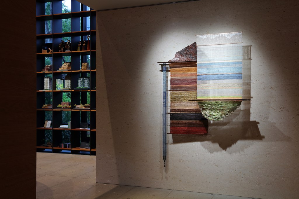 編織的過程宛如置身於一片連續的風景當中,雖然不見全貌,卻能透過綴拾零星片段,以及對未知地帶展開想像來彌合與擴充。這件作品以織布機控制經線密度的工具「筬」(reed)作為結構的中心,以各種纖維材質與織紋層層疊疊,往上往下探索地層與風景的切片。流瀉於織布機經緯邊界外的流蘇則形成山嶺駁坎與天光雲影,淡寫人與自然風景之間的進退和張力。作品藉經緯線交織,描摹天地間時間的積累,由地底岩層堆疊至海天光影,再到依附於大地蔓生的苔蘚;並藉由世界各地蒐羅來的媒材,如玻璃管珠、貝殼與蠶繭,加上厚塗的生漆與土,表現不同肌理與色澤,將水文、土壤的樣態囊括其中。